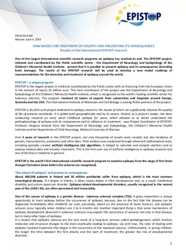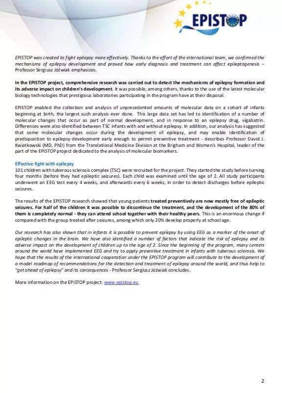 Az EPISTOP projekt bizonyította, hogy lehetséges megelőzni az epilepsziát és annak káros következményeit. A kutatás eredményei a jövőben az epilepszia diagnosztikájának és kezelésének az alapjait fogják adni. Az 5 éves projektet az Európai Unió közel 10 millió euróval támogatta. 16 szakértői csoport vett benne részt Európa, USA és Ausztrália szerte. A projektet a Varsói Egyetemi Klinika Gyermekneurológiai Osztályának vezetője, Professzor Sergiusz Jozwiak irányította.